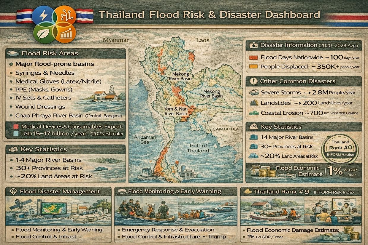 “Flood risk in Thailand is concentrated in the Chao Phraya River Basin, northern mountain river basins, the Mekong River Basin, the Eastern Economic Corridor (EEC), and southern river basins. These areas overlap with key industrial, agricultural, and logistics zones, where flooding directly impacts Japanese supply chains and food security.”